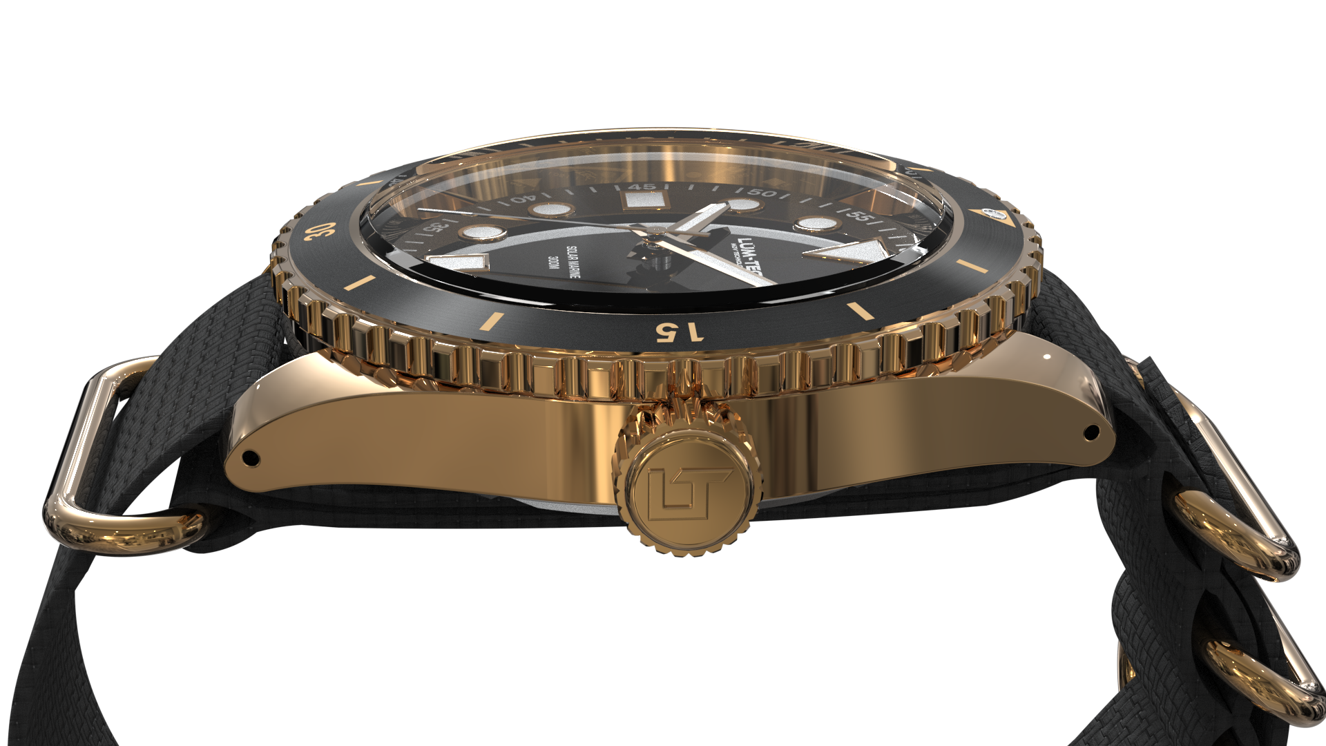 Silicone lubricated, double Viton gasket seals are in the crown and the tightly sealed, threaded caseback to resist saltwater, chemicals and extreme hot and cold environments. Our sealing system has been tested to exceed our 300 meter depth rating by 30% ensuring complete sealing in not only water depths but in all environments.